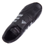 These Adidas shoes have a lace less design for easy on/easy off. Soft leather construction with a padded tongue for added comfort. Firm plastic arch support with Adidas stripes. Sole includes 2 pivot points for increased mobility when turning.