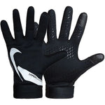 The Nike HyperWarm Academy Gloves are designed to help keep your hands warm, so you can focus on the game. Textured palms help you grip the ball during throw-ins, while touchscreen friendly tips let you access your phone after the game.