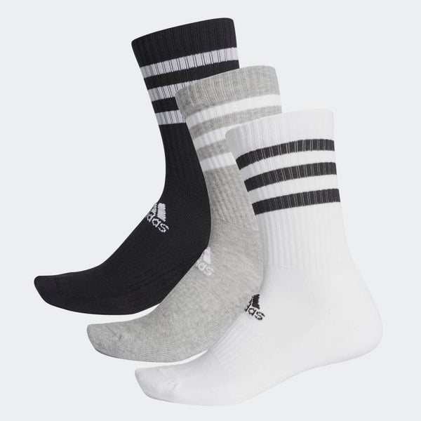 A strong athletic look meets foot-pampering softness. This trio of cotton-rich crew socks offers heel-to-toe cushioning for all-day comfort. Knit-in arch support and a smooth toe seam add to the snug fit and feel. The iconic 3-Stripes deliver instant adidas style.